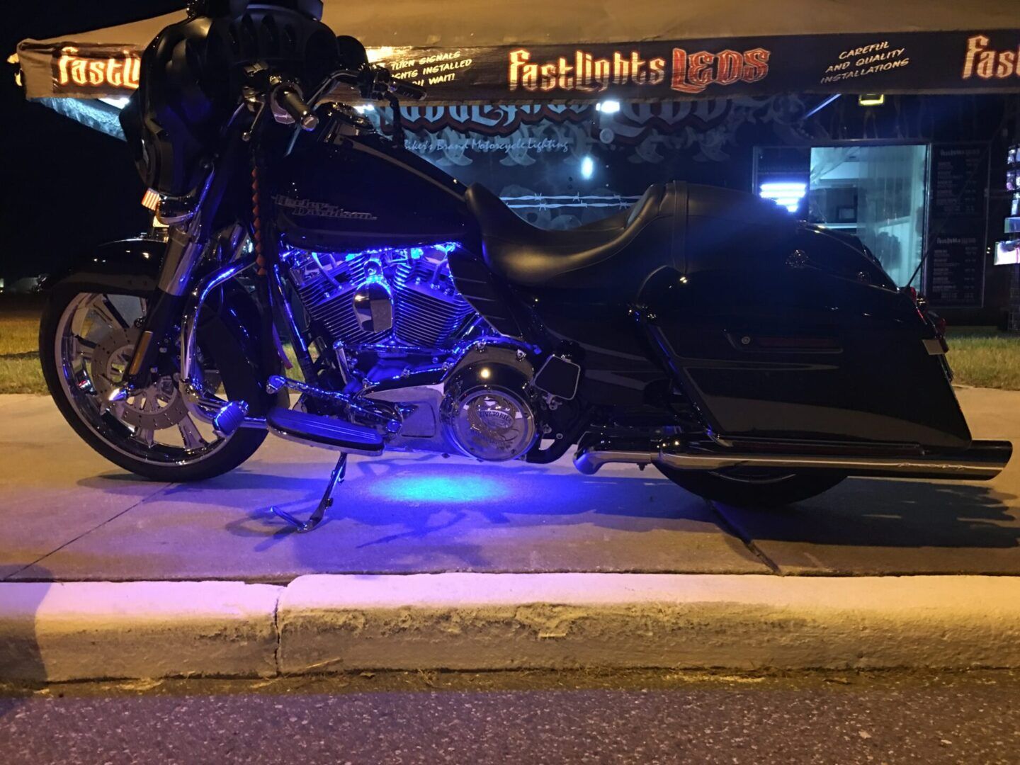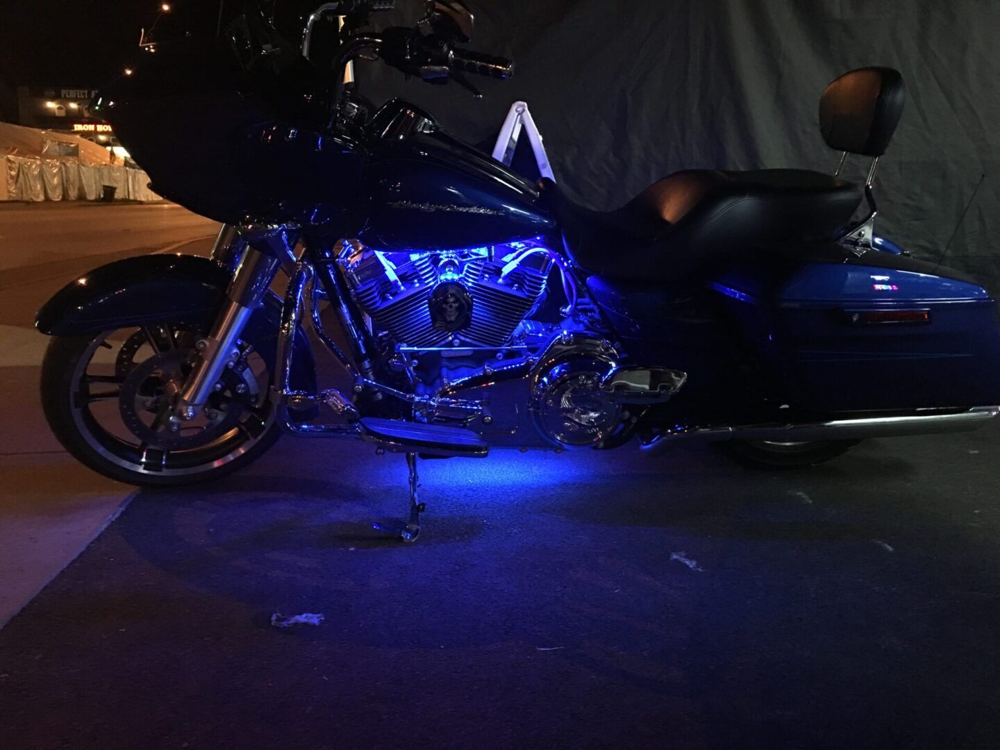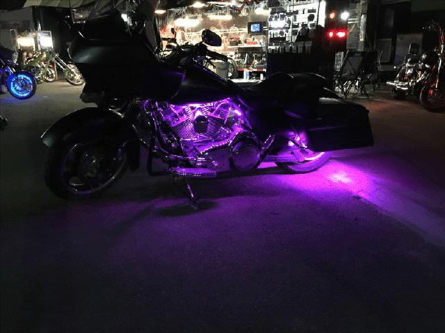 We recommend putting the 2 12″ strips under the air cleaner and horn. 2 of the 19″ Strips under your tank, and the other 2 19″ strips under the rear fender, or under the rear struts, or under your saddlebag rails. Another option for the other 2 19″ strips would be under the frame for a ground effect (some bikes you may need to trim them down so you can put the strips at a 45 degree angle to avoid scraping the strips).