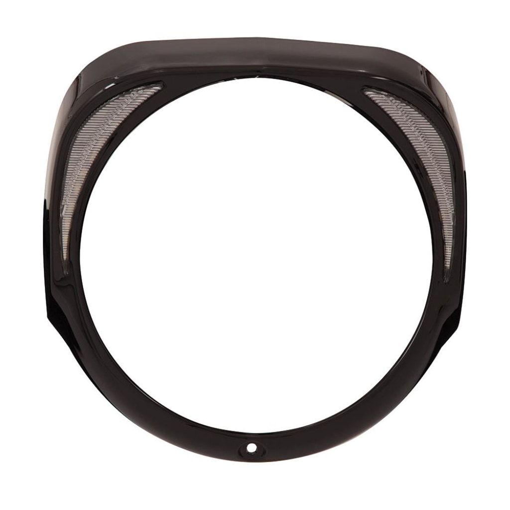 The FangĀ® LED Headlight Bezel is the finishing touch for your batwing fairing, featuring Everlight Automotive Grade LEDs in an ultra-streamlined housing. It is sculpted to perfectly fill the space around your headlight for a streamlined look. Included are white running lights with optional amber turn signals, adding extra function.