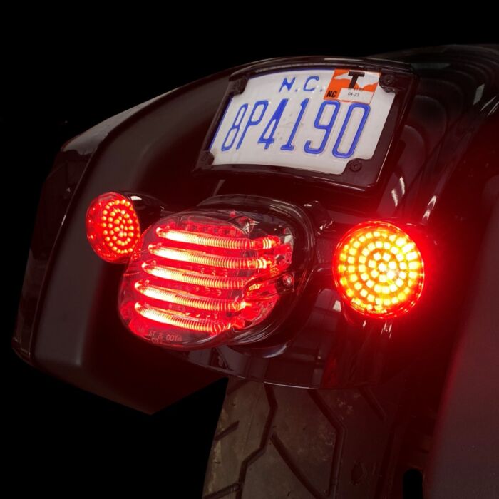 Red LEDs provide a bright red turn signal flash. Each GenesisĀ® 4 rear turn signal has a black circuit board with 48 red LEDs and 1156 pigtail bulb base. Plug and play replacement for OEM rear turn signal bulbs on Harley-Davidson motorcycles with bullet turn signal housing.