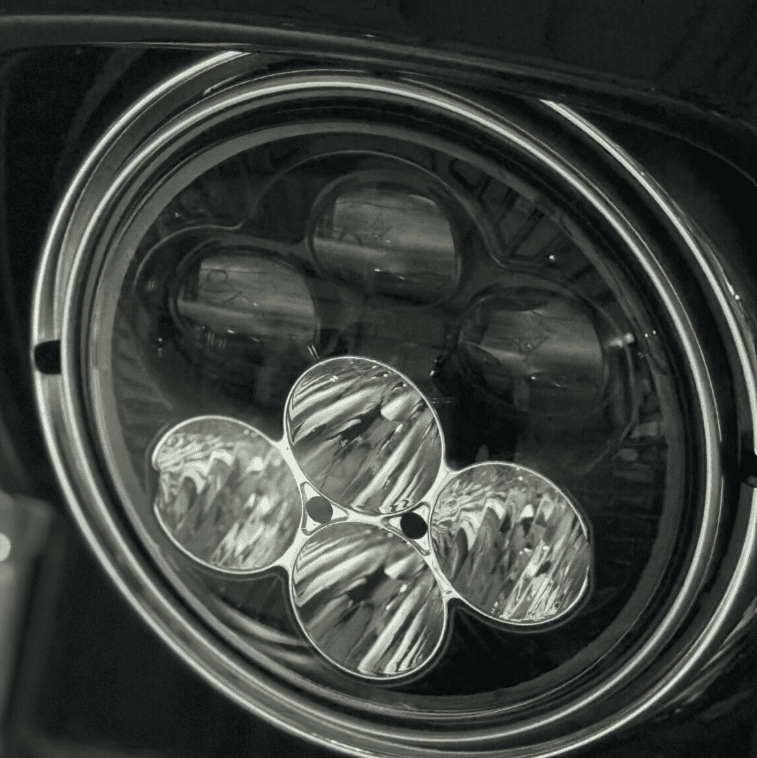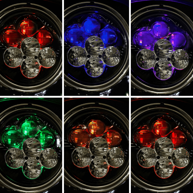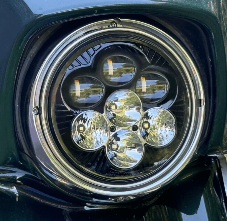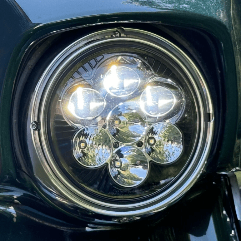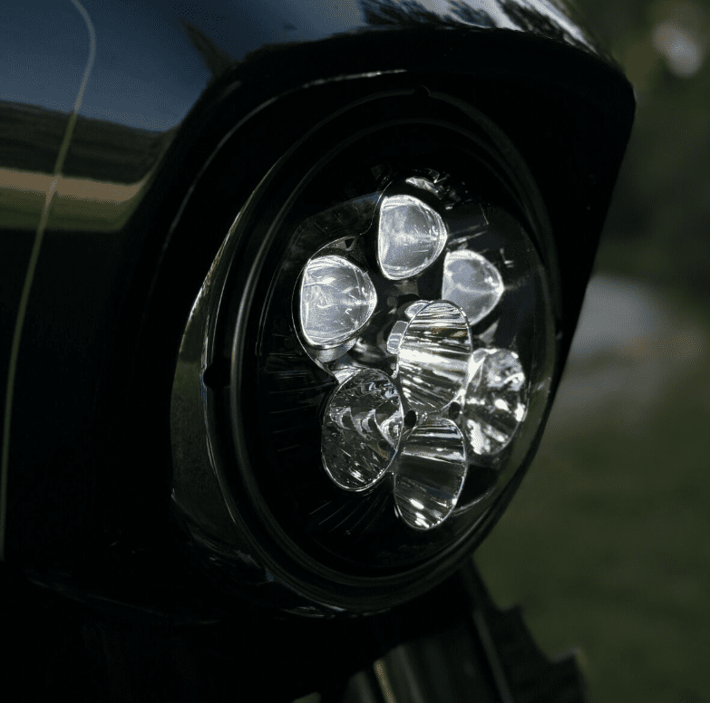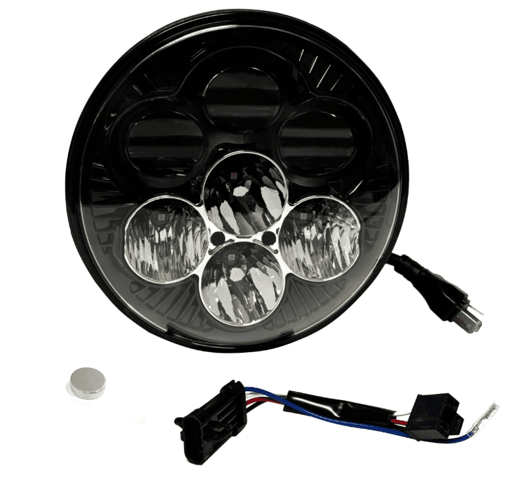 Elevate your ride to the next level of brilliance with our latest innovation! The Shark Demon™ LED motorcycle headlight is now available in a more traditional styled 7″ round lamp featuring a dynamic color-changing backlight. Low beam projects 3600 raw/2651 effective lumens from three projection-style LEDs. High beam adds four additional direct-reflective LEDs boasting an impressive 9080 raw/4485 effective lumens total. Single lamp assembly is completely sealed IP67, waterproof with clear polycarbonate lens and matte black aluminum housing. Color changing backlight is controlled by magnet operation. Select from one of six auxiliary backlight colors including orange, yellow, green, blue, purple, red or off. Assembly is equipped with H4 connector and includes wire harness to power backlight independently if desired.